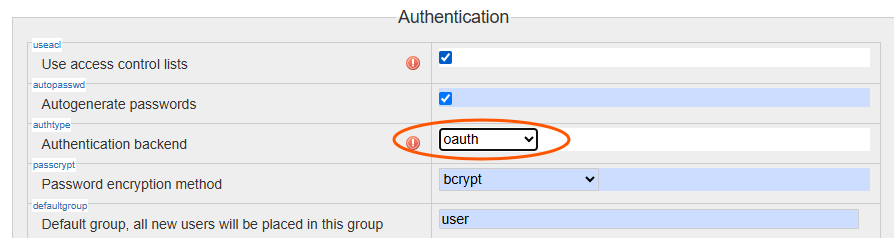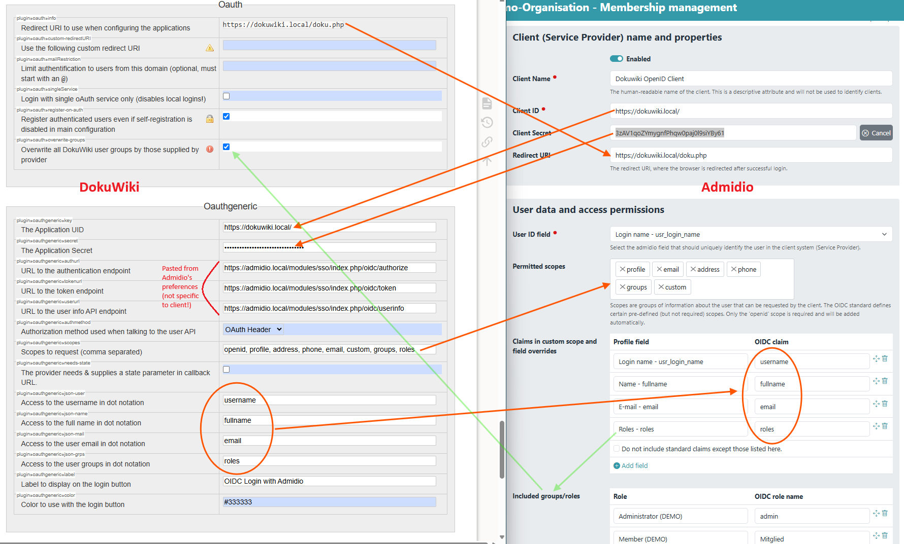 $conf['authtype'] = 'oauth'; $conf['superuser'] = '@admin'; $conf['plugin']['oauth']['register-on-auth'] = 1; $conf['plugin']['oauth']['overwrite-groups'] = 1; $conf['plugin']['oauthgeneric']['key'] = 'https://dokuwiki.local/'; $conf['plugin']['oauthgeneric']['secret'] = 'lWDQ......gU'; $conf['plugin']['oauthgeneric']['authurl'] = 'https://admidio.local/modules/sso/index.php/oidc/authorize'; $conf['plugin']['oauthgeneric']['tokenurl'] = 'https://admidio.local/modules/sso/index.php/oidc/token'; $conf['plugin']['oauthgeneric']['userurl'] = 'https://admidio.local/modules/sso/index.php/oidc/userinfo'; $conf['plugin']['oauthgeneric']['scopes'] = array('openid', 'profile', 'address', 'phone', 'email', 'custom', 'groups', 'roles'); $conf['plugin']['oauthgeneric']['json-user'] = 'username'; $conf['plugin']['oauthgeneric']['json-name'] = 'fullname'; $conf['plugin']['oauthgeneric']['json-mail'] = 'email'; $conf['plugin']['oauthgeneric']['json-grps'] = 'roles'; $conf['plugin']['oauthgeneric']['label'] = 'OIDC Login with Admidio';