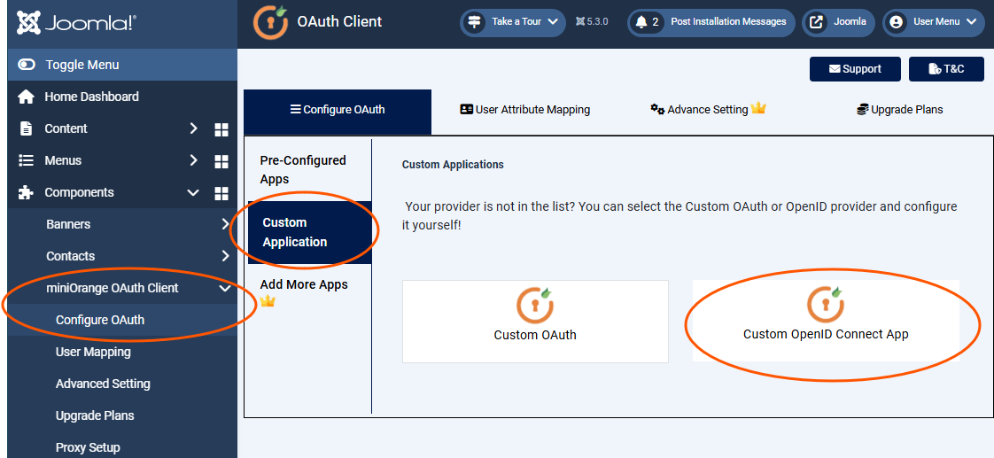 Configure the plugin in Joomla's Administration area in the menu section “Components” → “miniOrange OAuth Client” → “Configure OAuth”.
