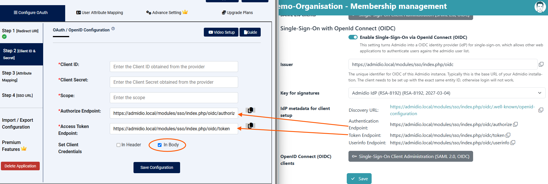 - Configure it either with Admidio's discovery URL (if supported), or enter the EntityID and the URL endpoints for authentication, token and userinfo.