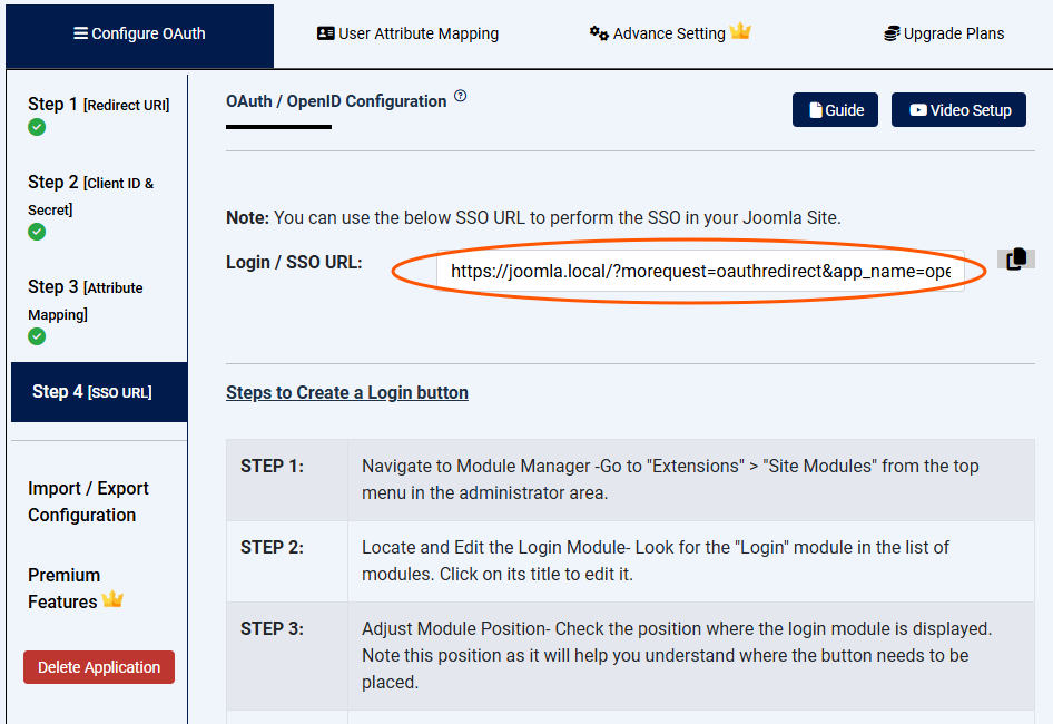 Although the plugin configuration is finished, the plugin does not automatically replace Joomla's login form with the OpenID login link, which is shown in Step 4. Rather, one has to create a custom Joomla module or menu item that uses the provided login link as target.