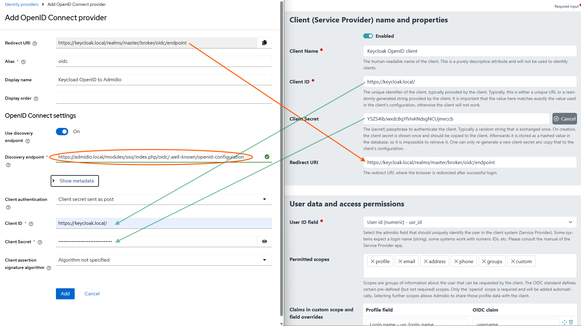Copy both the Client Name and the Client Secret to Keycloak, and at the same time copy the provided Redirect URL from Keycloak to Admidio.
