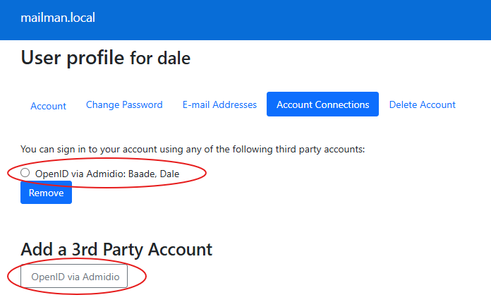 After saving the changes (both in Mailman3 and Admidio), the apps should should now be set up for single-sign-on in Mailman3.