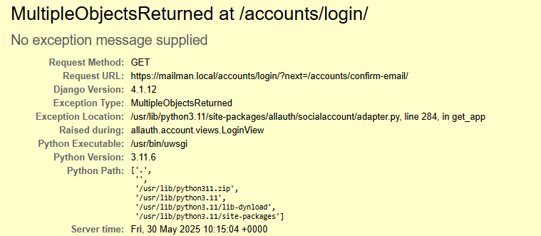 The OpenID Provider can be configured in Mailman3 either textually in the /opt/mailman-web/settings_local.py configuration file or via the graphic Django UI available at https://[YOUR_MAILMAN]/admin/. Both methods are equivalent. If you set up two (even identical) providers, an error message about duplicate objects will be triggered ('MultipleObjectsReturned at /accounts/login/').