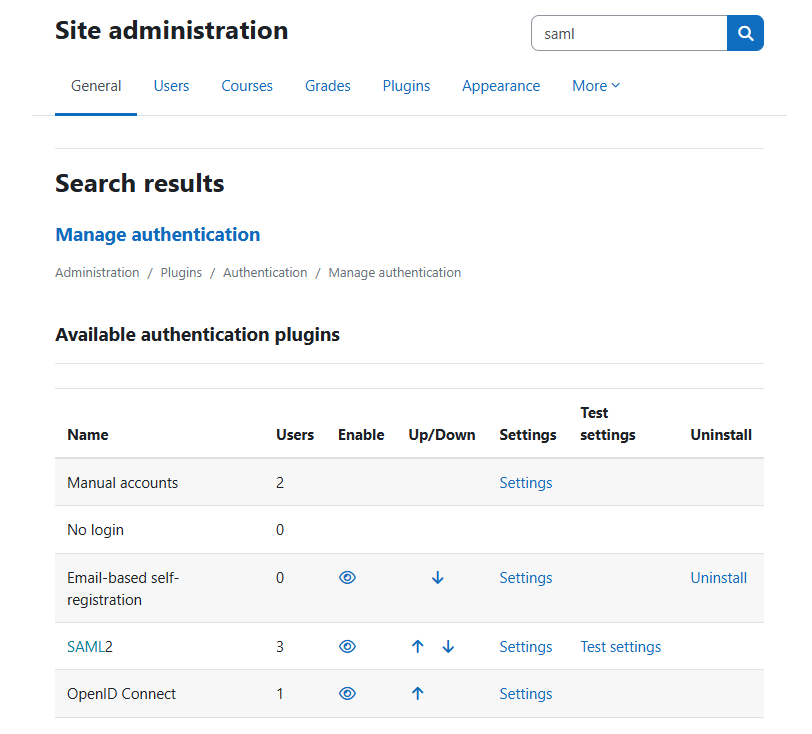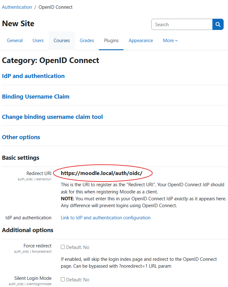 - After installing this plugin, go to the plugin list and scroll down to the “Authentication” section (or alternatively, use the URL https://[YOUR_MOODLE]/admin/settings.php?section=manageauths). The OIDC plugin should be shown together with a link to the settings.