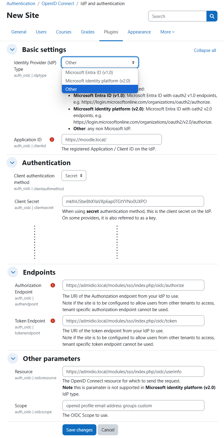 - Configure it with Admidio's endpoint URLs for authentication, token and userinfo, and enter the EntityID. Auto-discover is currently not supported by the Moodle plugin.