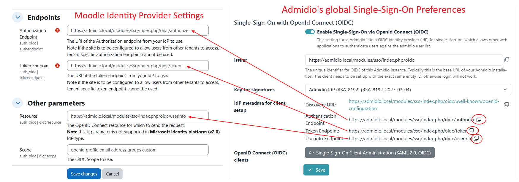- Go to Admidio's Single-Sign-On Preferences and copy the endpoint URLs for OpenID (Authentication, token and userinfo endpoints). They should be pasted into Moodle's Client configuration as “Authorization URL”, “UserInfo URL” and “Token URL”.