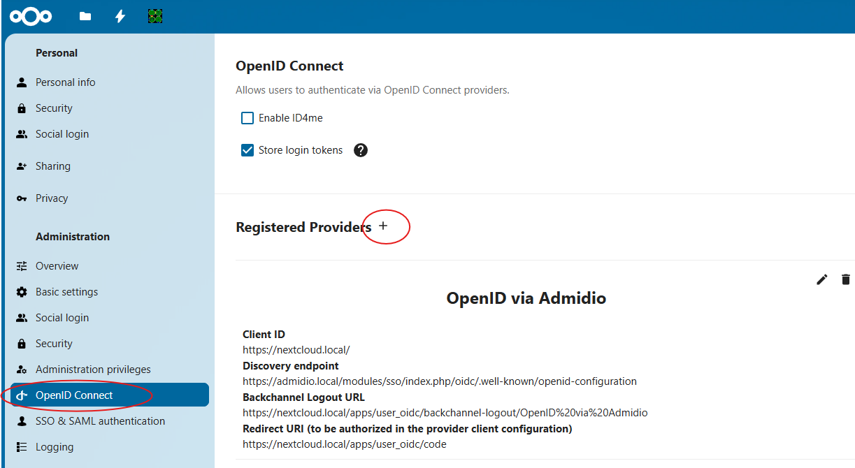 - After installation it can be configured by an administrator in Nextcloud's preferences in the menu item “Administration” → “Social Login”. Next to the “Custom OpenID Connect” header, click the “+” link to create a new OpenID provider. The Internal name is the identifier that is used in the (Redirect) URL and must not contain special characters, spaces, etc. The Title is the human-readable name that will be displayed in the login button.