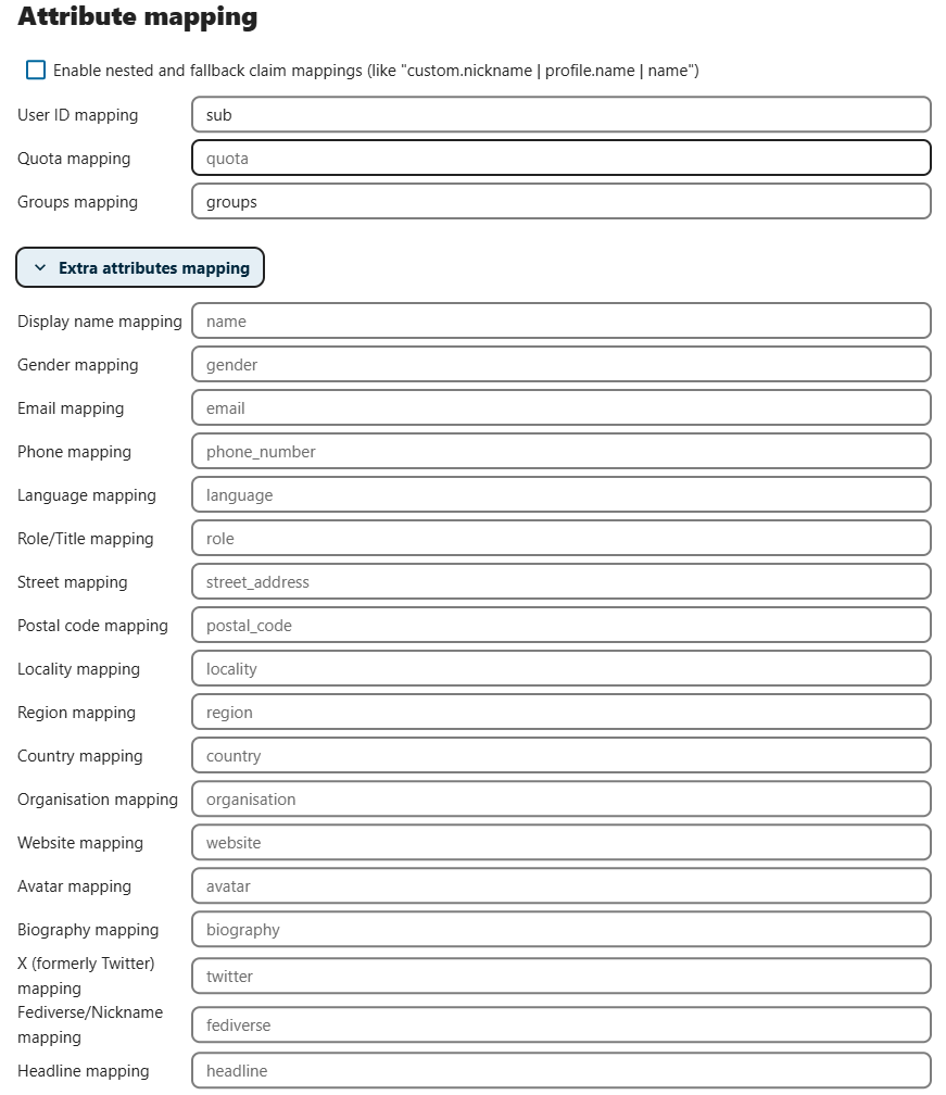 - In addition, Nextcloud also provides settings to map OpenID claims (defined profile fields with a fixed name, defined in the OpenID standard) to the Nextcloud user's profile data. None of them are required, but they can be mapped, if profile information should be transferred from Admidio to Nextcloud: