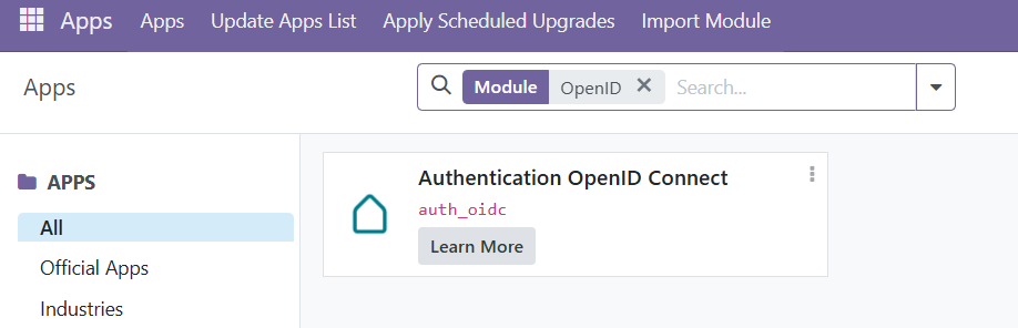 First, install the Authentication OpenID Connect (auth_oidc) app in Odoo: