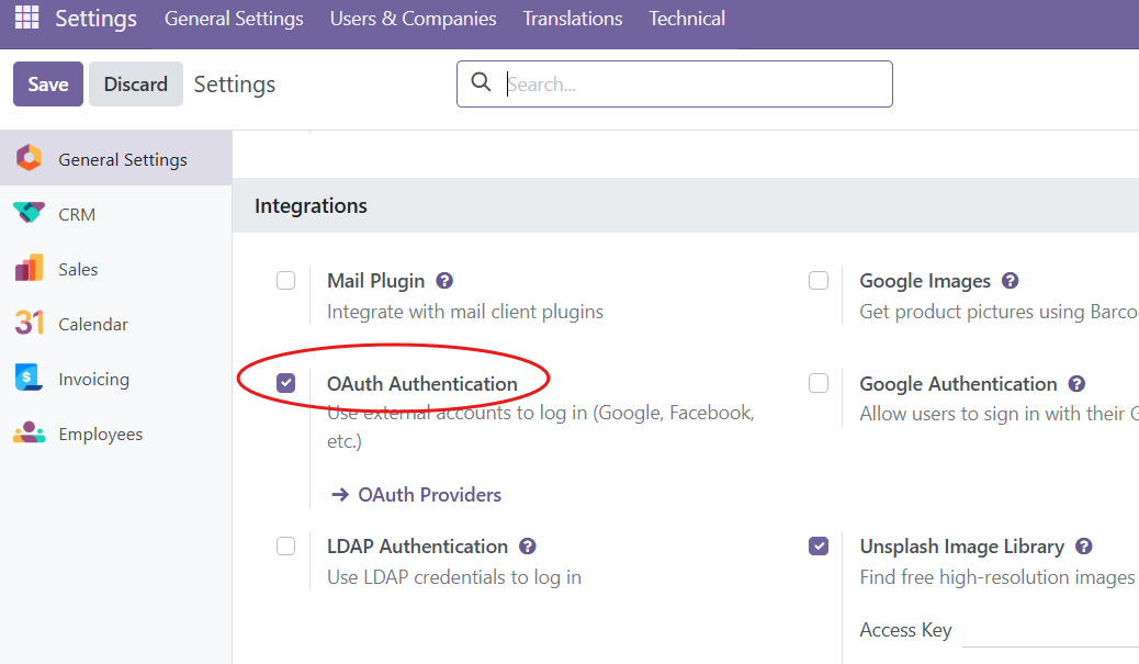 - Make sure the OAuth Authentication is enabled in the “Integrations” section of the “General Settings”.