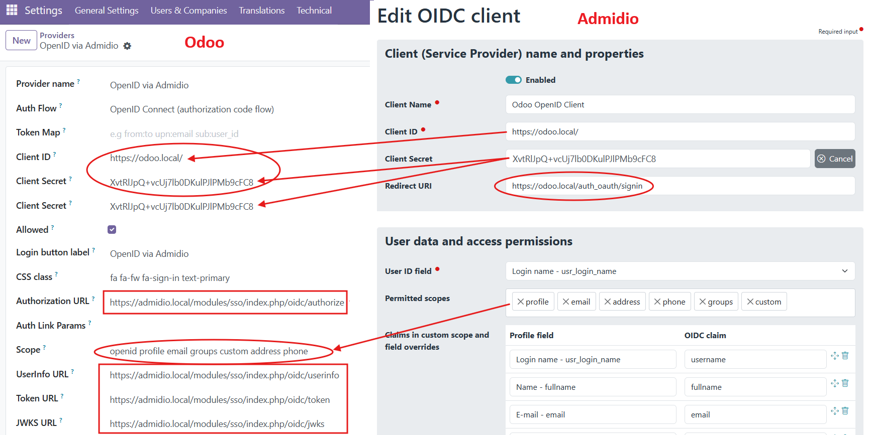 - The “Client ID” and “Client Secret” in Admidio and Odoo have to match exactly. The ID is typically the client's URL, although some clients allow any unique identifier. The Client Secret should a random string and will serve like a password. Admidio will create one and allow it to be copied to the client. Afterwards it is only stored as a hash in the database and not be recovered any more. However, one can create a new Client Secret in Admidio and copy that to the client's configuration.