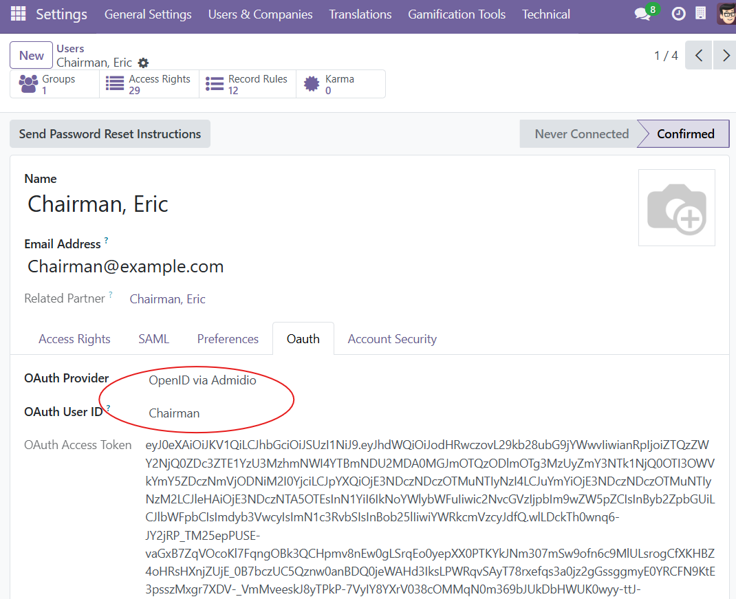 If you look at the user profile in the admin backend, the Admidio account will be connected to the (existing or newly created) Odoo account and the user Id and OAuth Access Token stored in the user profile for future login.