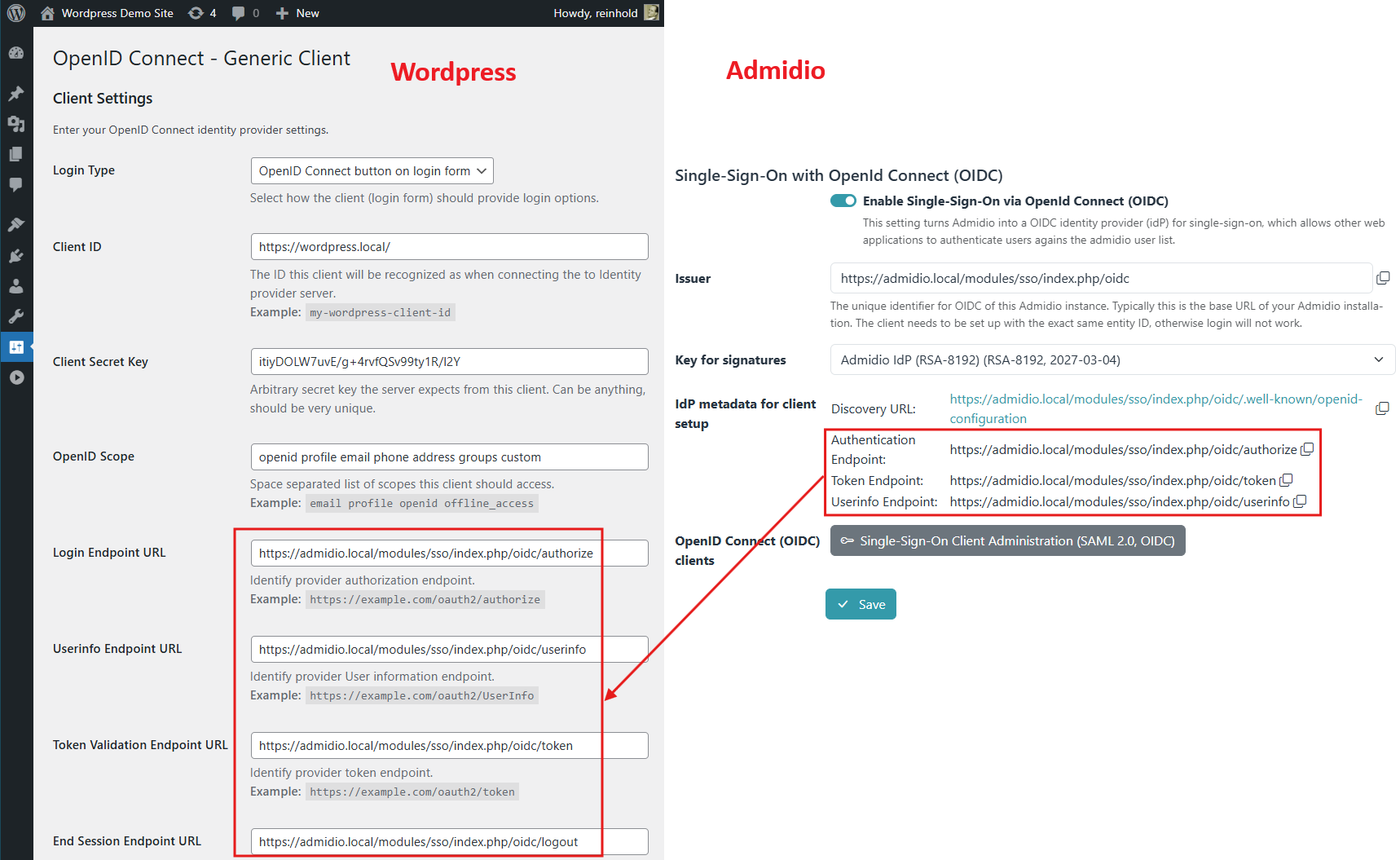 - Configure it either with Admidio's endpoint URLs for authentication, token and userinfo, and enter the EntityID.