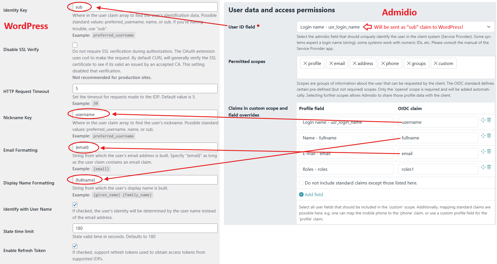 - Enter the scopes you desire in the WordPress config and make sure that Admidio's config matches it. At least openid must be included (Admidio will implicitly add it). Sonce the WordPress plugin does not support OpenID groups, the presence of the “groups” scope has no effect.