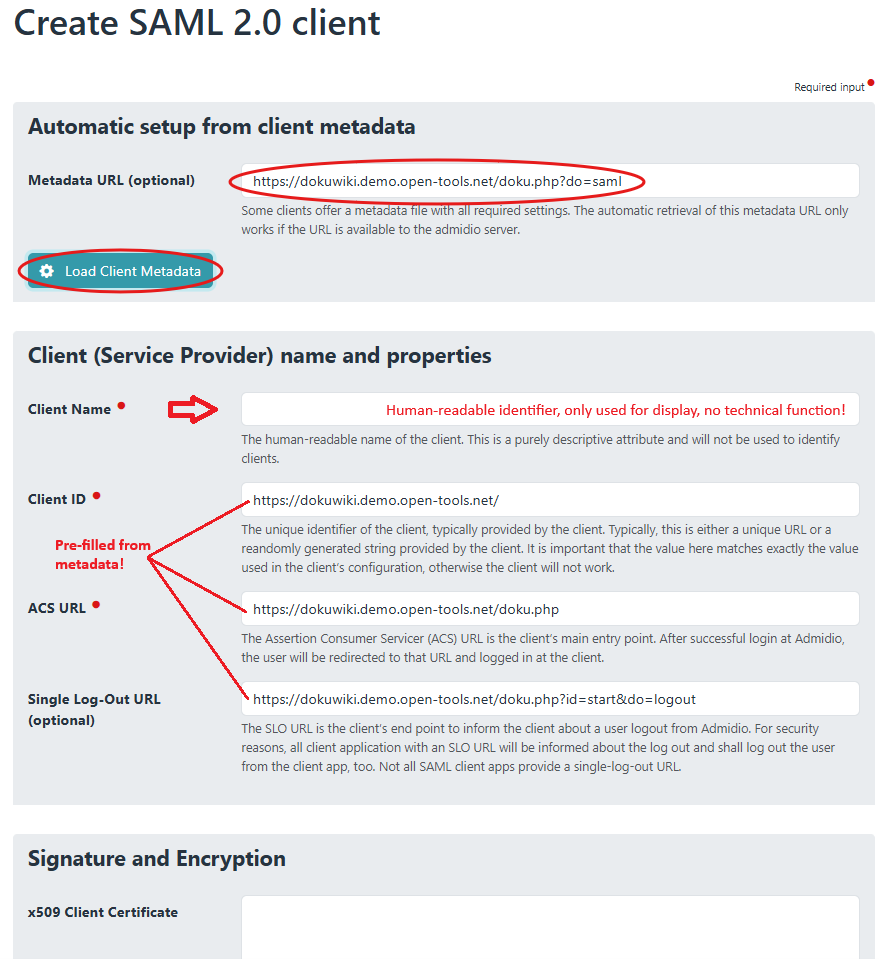Paste that metadata URL into the corresponding input field at the top and click “Load Client Metadata”. This should load all settings from Dokuwiki and pre-fill the following fields correctly. Only the Client Name needs to be entered. Choose any name to clearly identify the client in the list of SAML clients. There is no functionality depending on the name.