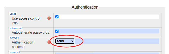 Once all settings are done, it is time to enable the saml plugin for login to DokuWiki in the “Configuration Settings”: