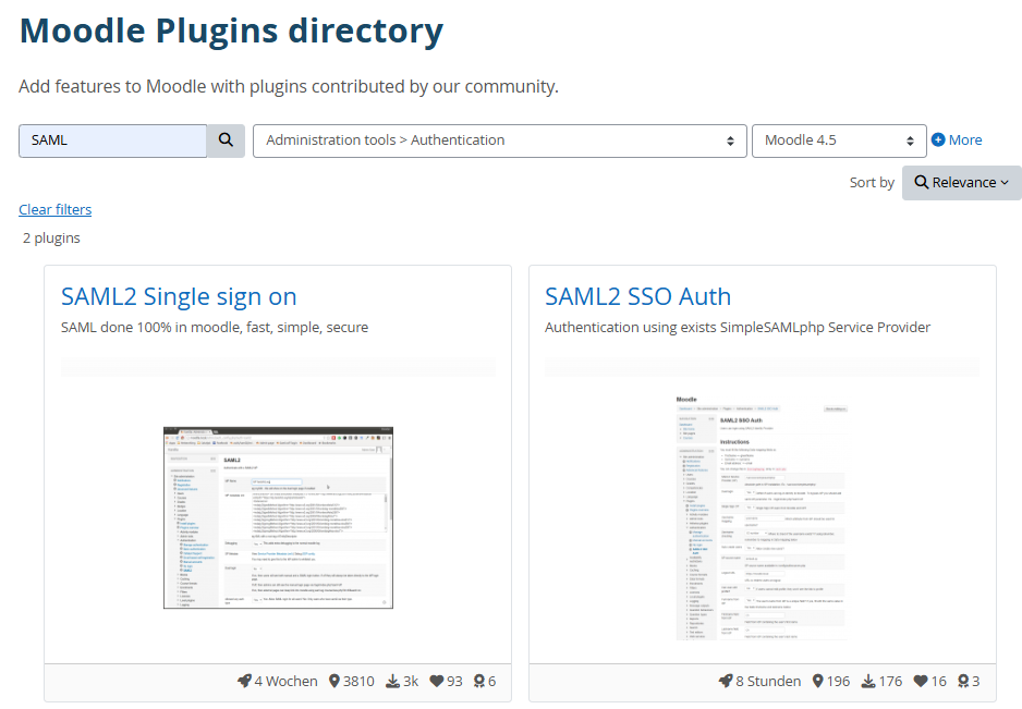 There are several SAML plugins for Moodle. We will describe SAML login via the “SAML2 Single sign on” plugin. Unfortunately, that app does not (yet) use rule mapping (i.e. using Admidio groups to grant permission in Moodle).
