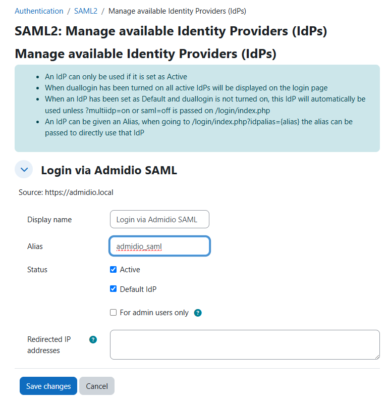 • The Entity ID is the most relevant identifier that needs to match in Moodle's and Admidio's configuration, otherwise login to Moodle with SAML using Admidio as login backend will not be possible. If the field is left blank, the plugin will generate a unique identifier. One can also choose any other unique string, typically the URL of the Moodle installation.