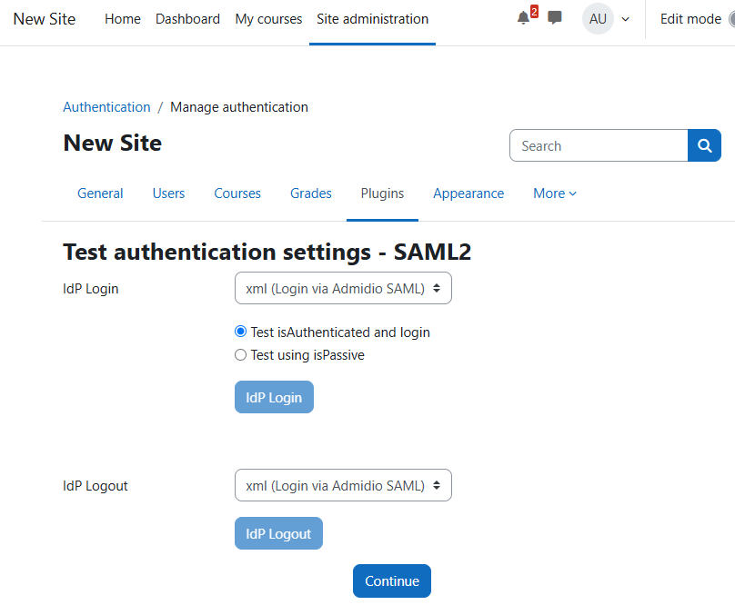 Admidio and Moodle should now be set up to use Admidio for logging in to Moodle. The SAML plugin even provides a way to test the plugin configuration: Return to Moodle's plugin list (see above), which shows a “Test settings” next to the “Settings” link for the plugin: