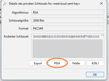 Moodle also requires a private key / public certificate pair to sign messages sent to the Admidio IdP. These need to be uploaded into the Moodle SAML config as individual files in PEM format and can be generated by openssl's command line tools, by sites like https://www.samltool.com/self_signed_certs.php or in Admidio's key administration. Simply create a new Key for Moodle (RSA 2048 bits). The certificate can be copied directly from the key's edit page, but the private key is not available in Admidio's GUI for security reason. Instead, it can be downloaded (secured with a password!) from the list of keys in Admidio: