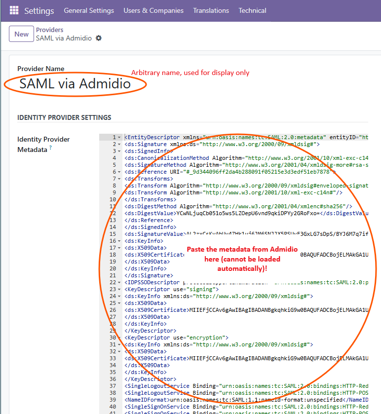 While the app supports IdP metadata import from Admidio, the corresponding metadata xml file is not automatically loaded, but the xml contents need to be pasted. Download the metadata xml file from the link given in Admidio's preferences (typically https://[YOUR_DOMAIN]/modules/sso/index.php/saml/metadata), open the file and copy the xml contents to Odoo's configuration: