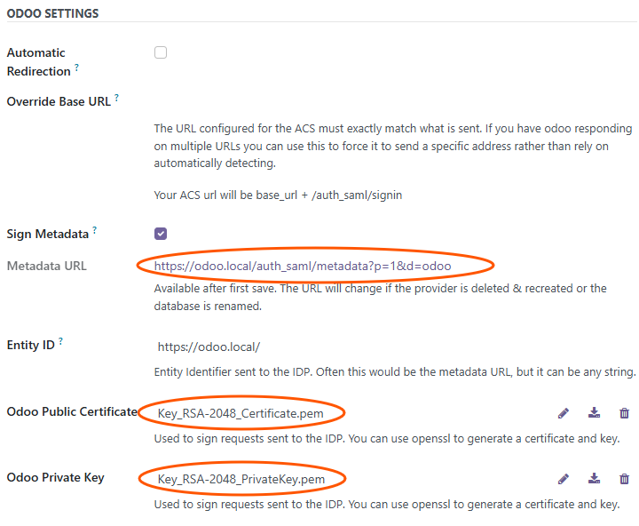 Once the metadata xml is pasted, Odoo will pre-fill most settings: