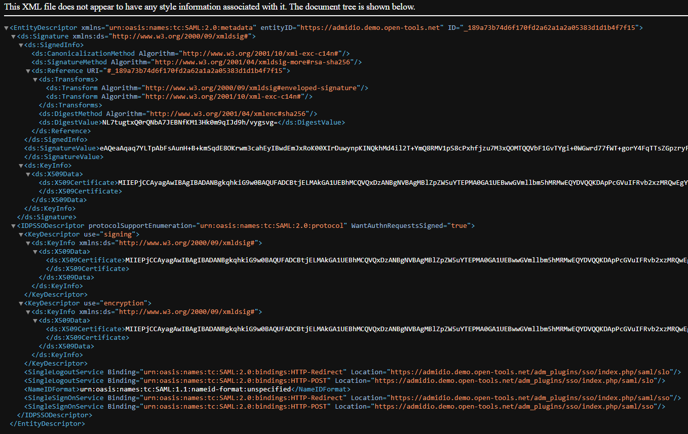 Notice that it contains both the public key / certificate of the signing and encryption keys, as well as the URLs to the SingleSignOnService (SSO) and the SingleLogOutService (SLO) at the admidio installation. Furthermore, the first half of the XML contains the cryptographic signature of the XML, signed with the private key to prove that the metadata file actually comes from the admidio installation and not from some adversary.