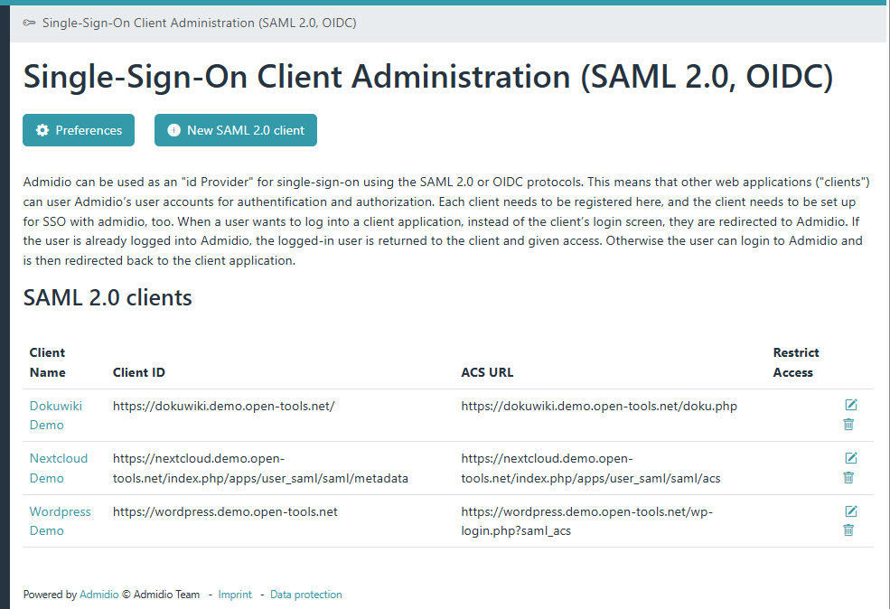 Once the client is set up to send authentication requests to Admidio, Admidio needs to be configured to respond to them. All SAML clients (Service Providers) are configured in the SSO Client Administration page, which can be reached from the SSO Preferences page (https://admidio.demo.open-tools.net/modules/preferences.php?panel=sso) from the SSO SAML preferences page.
