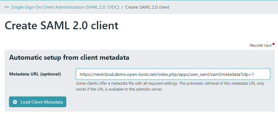 - Ideally, the client (“Service Provider”) will provide a link to xml metadata. Paste this URL and let Admidio automatically load the configuration.