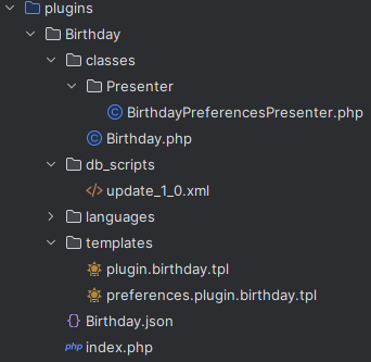 The basic folder structure of any plugin is shown below using the “Birthday” overview plugin as an example: